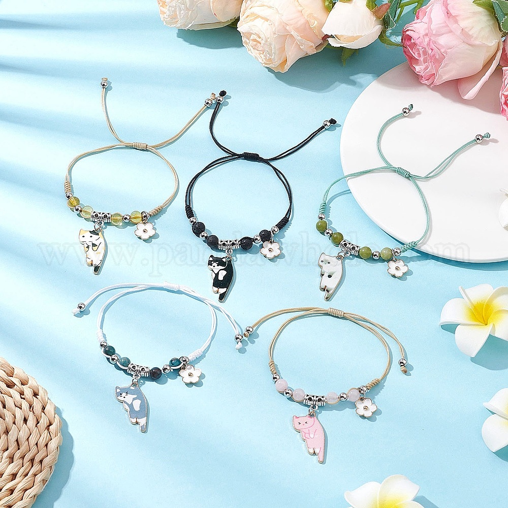 5шт 5 цвета натуральные драгоценные камни бусины плетеные браслеты из бисера, кот и клевер, с подвесками из печатного сплава и нейлоновой нитью