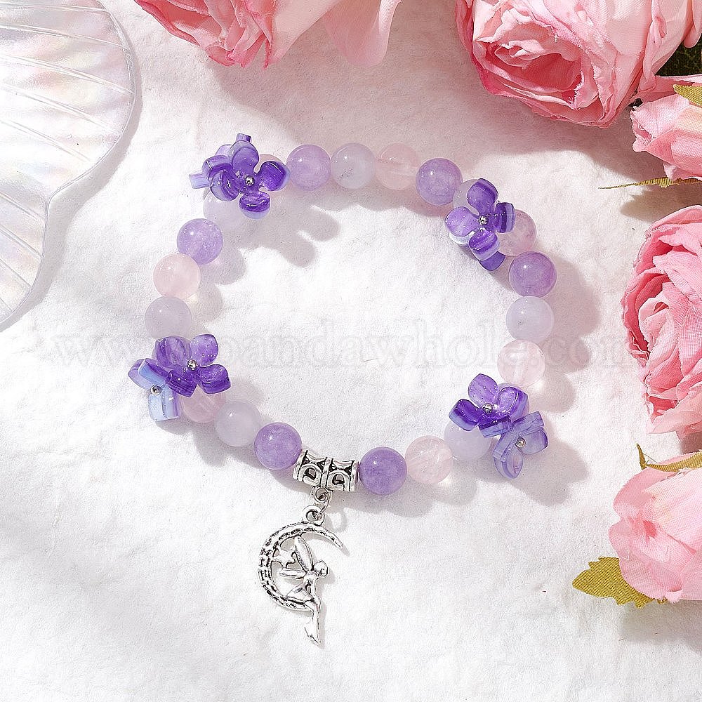 • Розовый Кварц Браслеты с подвесками из натурального розового кварца с круглыми бусинами, луна с ангелом, с подвесками из смоляных бусин и сплава, внутренний диаметр: 2-1/4 дюйм (5.55 см)