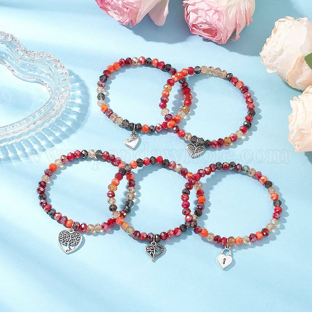 5шт. браслеты из сплава с подвесками в виде сердца, браслеты из граненых стеклянных бусин для женщин