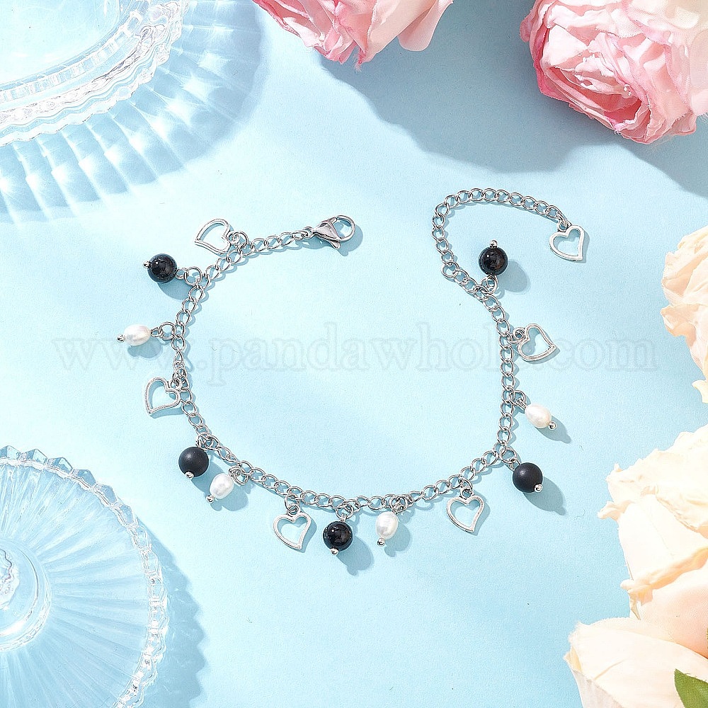 304 Браслеты с подвесками из нержавеющей стали для женщин, сердце, с натуральным черным агатом и натуральным жемчугом