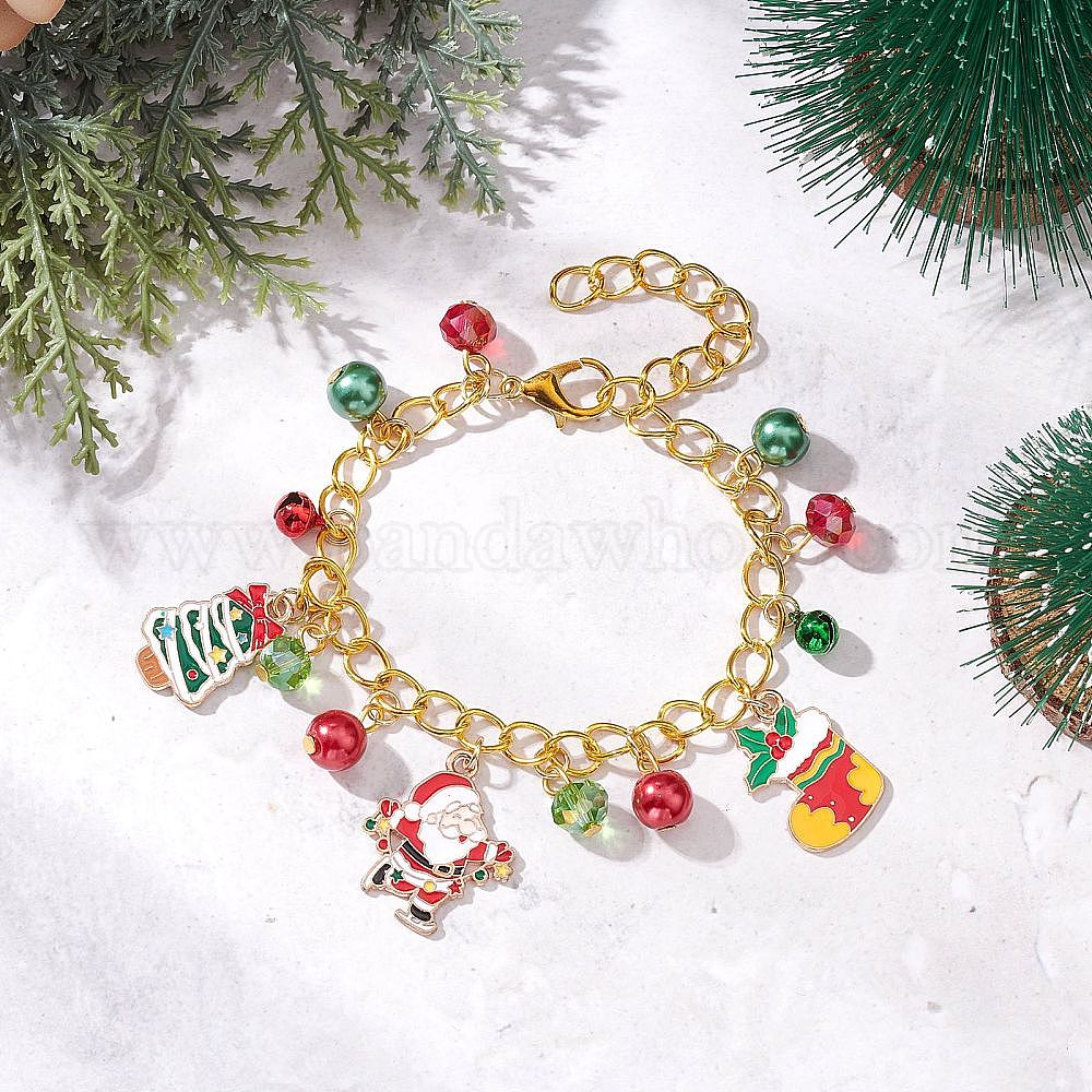 Рождественские браслеты с подвесками из эмали из сплава, Браслеты с круглыми подвесками из латуни с вакуумным покрытием PVD и стеклянным жемчугом, с цинковым сплавом застежками омаров коготь