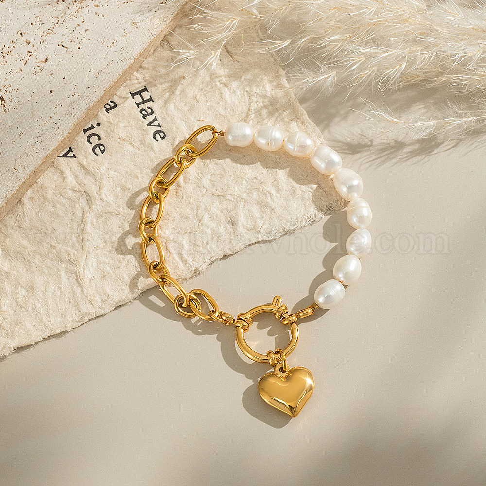 304 из нержавеющей стали шарм браслеты, Браслеты из цепочек и натурального пресноводного жемчуга для женщин, сердце