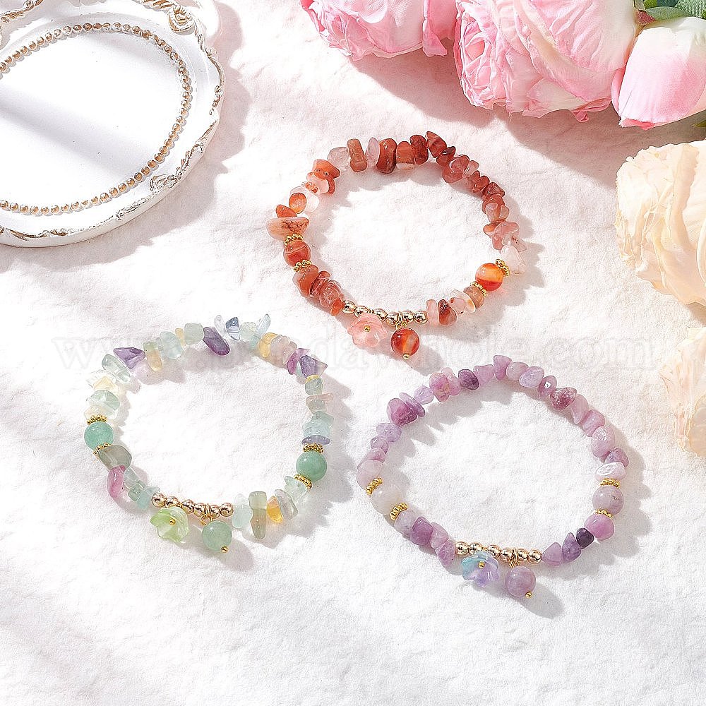 • Флюорит Браслеты с подвесками из натуральных флюоритовых бусин и цветков, эластичные браслеты для женщин, со стеклом, внутренний диаметр: 2 дюйм (5 см)