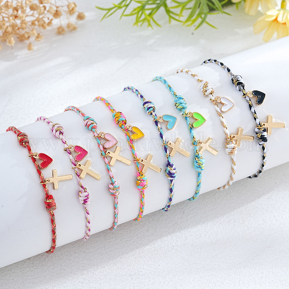 Латунь шарм браслеты, плетеные браслеты из синтетического шнура для женщин, крест и сердце