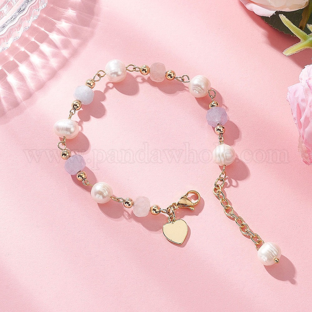 • Золотой Женские браслеты из круглых бусин с натуральным культивированным пресноводным жемчугом, натуральным лавандовым аметистом, аквамарином и мадагаскарским розовым кварцем, золотые, 7-1/8 дюйм (18 см)