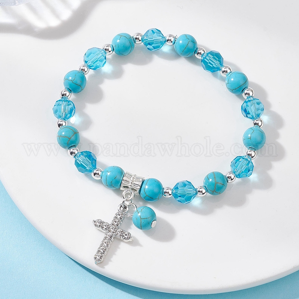 Браслеты с подвесками из сплава крест-накрест со стразами, круглые эластичные браслеты из синтетической окрашенной бирюзы и стеклянных бусин для женщин