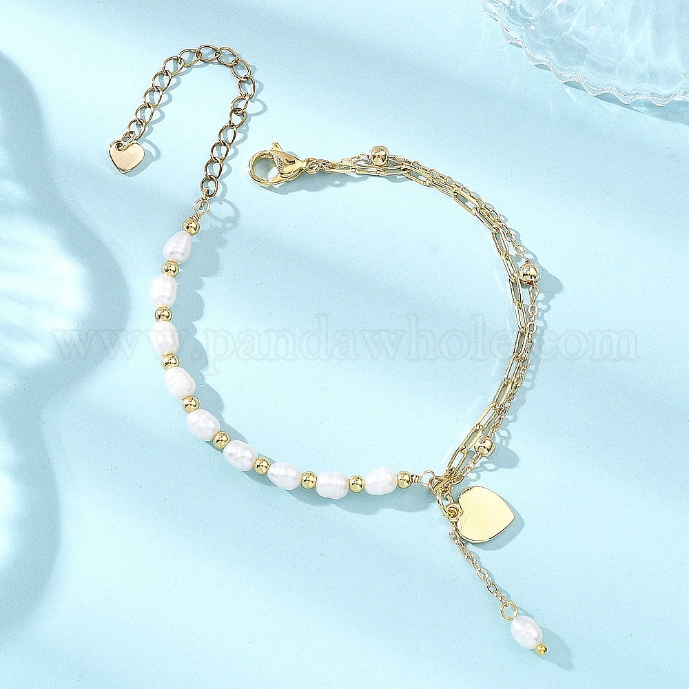 • Золотой Браслеты-цепочки с подвесками в форме сердца из латуни, скрепками и кабелями, женские браслеты из бисера из натурального культивированного пресноводного жемчуга, золотые, 7-1/8 дюйм (18 см)
