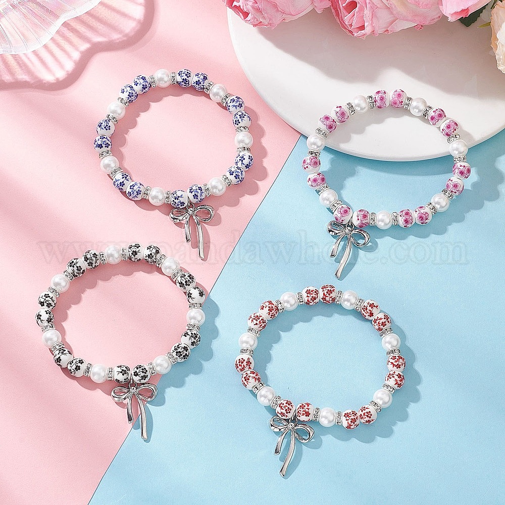 Браслеты из напечатанного фарфора и стеклянного жемчуга для женщин, браслеты с подвесками в виде банта из латуни, платина