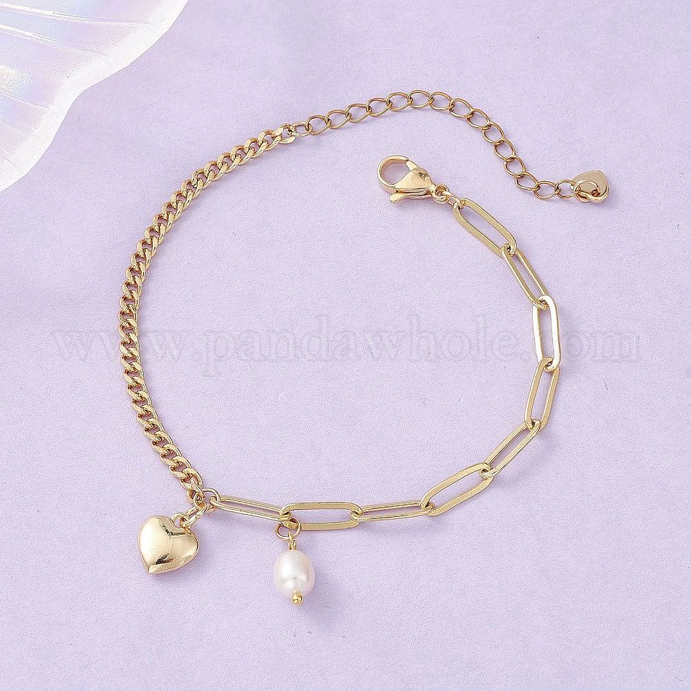 Браслеты с подвесками в форме сердца из латуни и натурального культивированного пресноводного жемчуга, латунные браслеты из скрепок и цепочек-панцирей для женщин