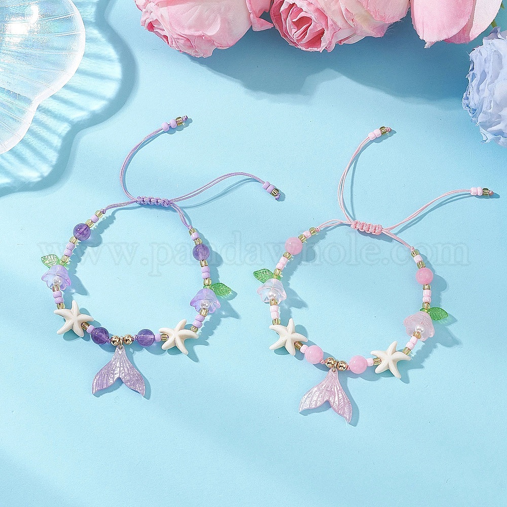 2шт. 2 браслеты с подвесками из смолы разных цветов, Женские плетеные браслеты из стеклянных бусин, синтетической бирюзы, натурального аметиста и желтого нефрита, морская звезда и хвост русалки