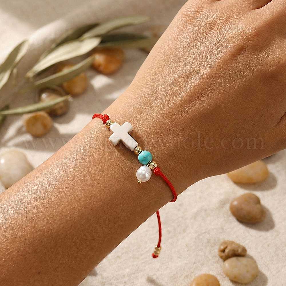 Регулируемые браслеты со стеклянными подвесками, Украшения для женщин из окрашенной синтетической бирюзы и латунных бусин., крестик