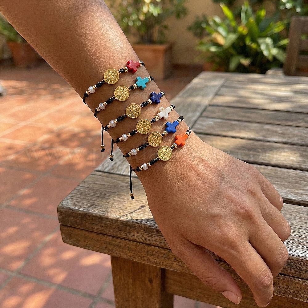 6шт. браслеты ручной работы из латуни, Браслеты из окрашенных синтетических бирюзовых бусин, плетеные из бусин, для женщин и мужчин., Плоская круглая фигурка со святым Бенедиктом и крестом.
