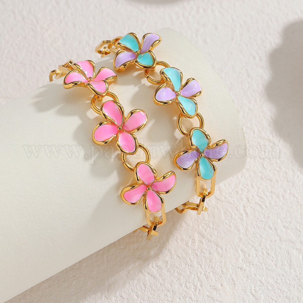 • Ярко-Розовый 304 браслеты-цепочки из нержавеющей стали с эмалированными цветочными звеньями, браслеты-цепочки со скрепками для женщин, золотые, ярко-розовый, 7.09 дюйм (18 см)