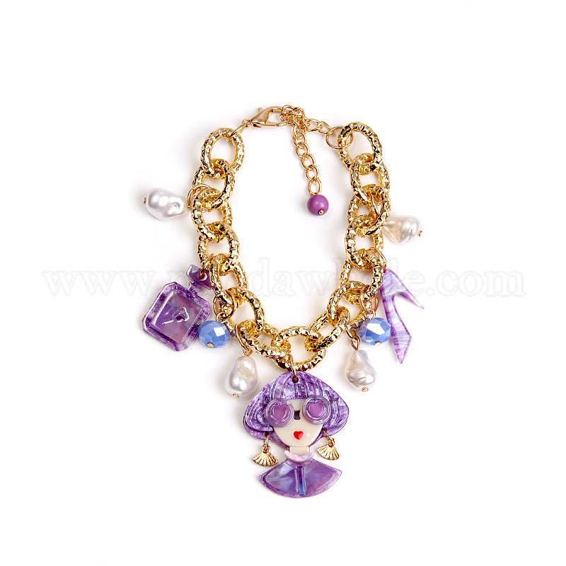 • Темно-Фиолетовый Акриловый флакон женских духов, туфли на высоком каблуке и браслеты из искусственного жемчуга., браслеты из сплава и цепи для женщин, золотые, темно-фиолетовый, 7.68 дюйм (19.5 см)