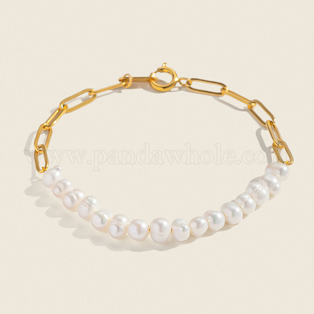 Браслеты из натуральных пресноводных жемчужин, 304 Браслеты из нержавеющей стали в виде цепочки-скрепки, украшения для женщин, круглые