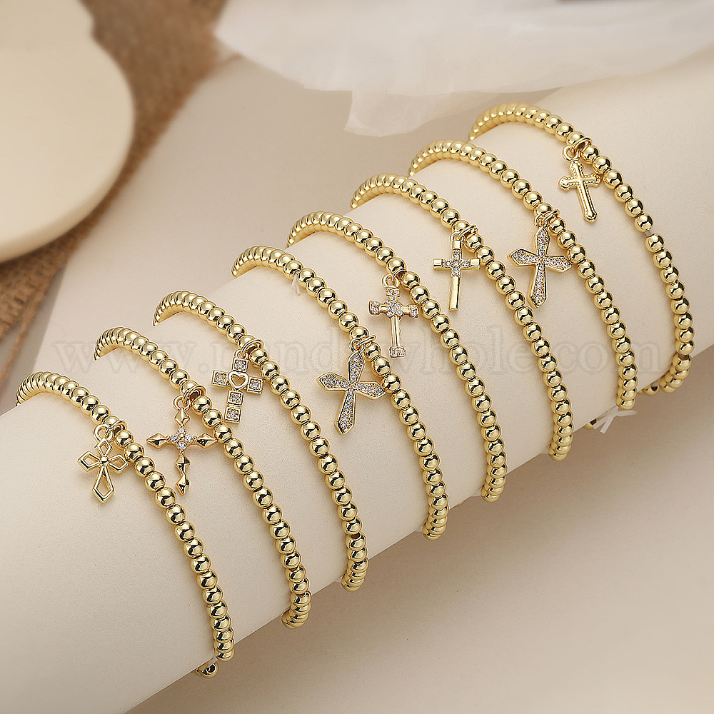 Браслеты с подвесками из латуни с прозрачным кубическим цирконием, круглые бусины эластичные браслеты для женщин, крестик