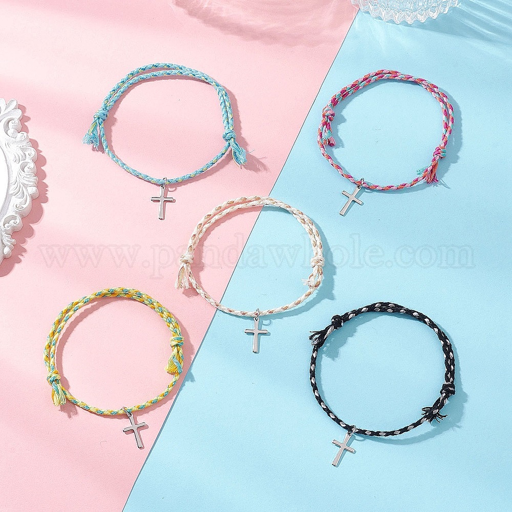201 из нержавеющей стали крест шарм браслеты, браслеты из хлопковой плетеной веревки