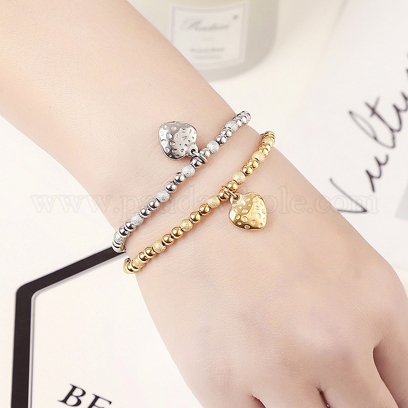 304 Браслеты из нержавеющей стали, Сердце шарм браслеты, круглые бусины эластичные браслеты для женщин