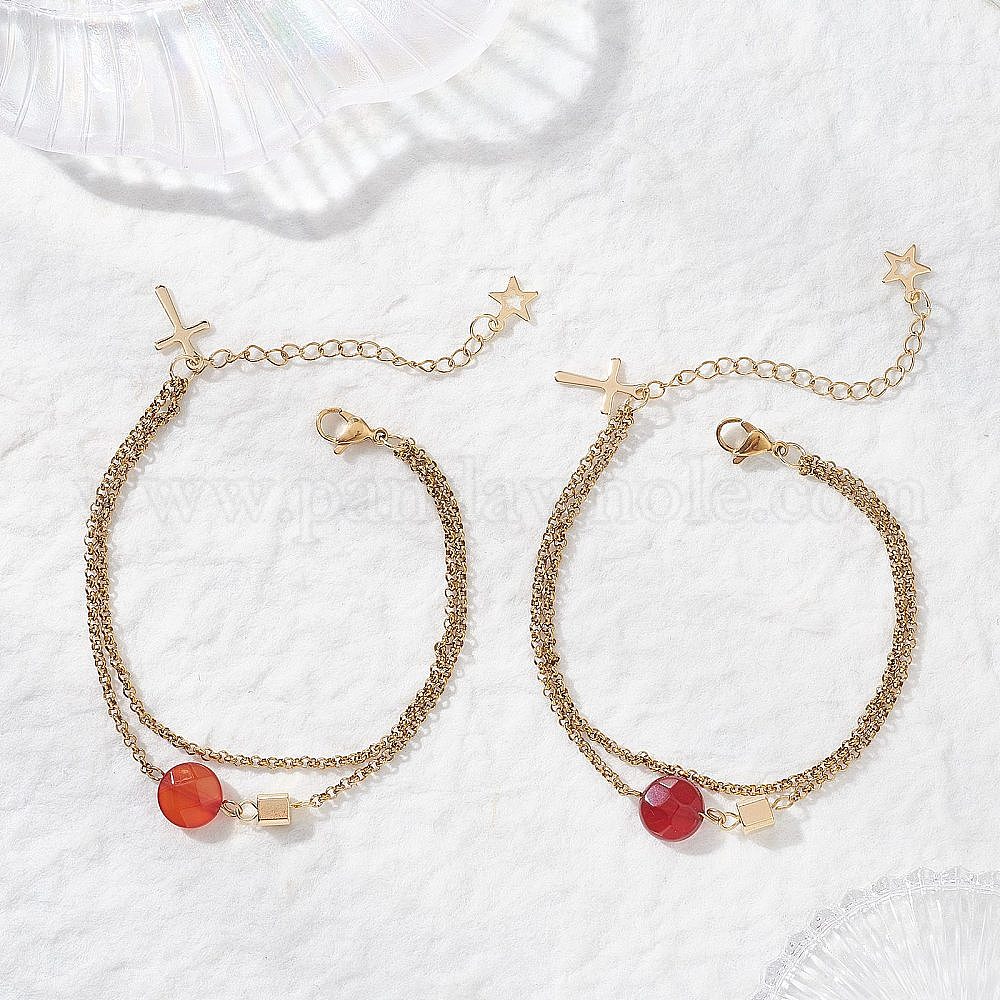 Браслеты из натурального красного агата ограненных плоских круглых звеньев с латунными кубическими элементами., 304 Браслеты из нержавеющей стали с цепочками роло, двухслойные