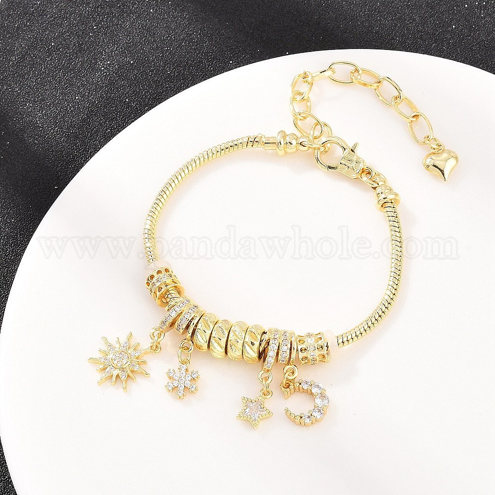 Браслеты из латуни с микропаве, прозрачными кубическими циркониями и европейскими бусинами-шармами., Цепочка-змейка с подвесками в виде солнца, звезды, сердца и снежинки — украшение для женщин., долговечный, стойки покрытие, без свинца и без кадмия (03AMRP)