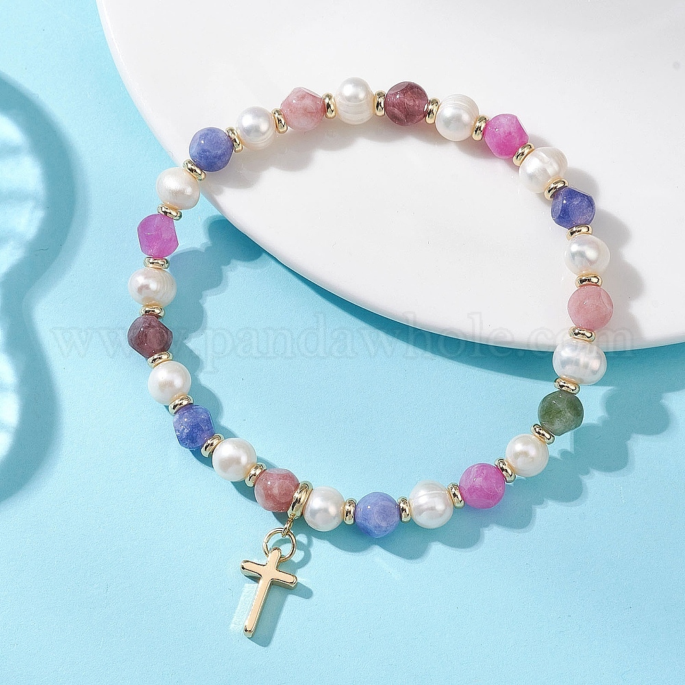 Браслеты с подвесками в виде креста из латуни, Натуральные многоцветные браслеты из турмалина и пресноводного жемчуга, эластичные, для женщин.