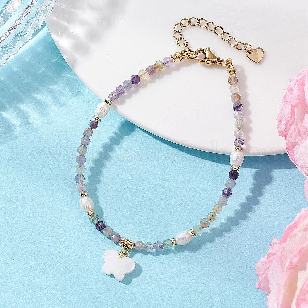 • Разноцветный Браслеты с подвесками в виде бабочек и натурального культивированного пресноводного жемчуга, Браслеты из натуральных флюоритовых бусин для женщин, С пресноводной оболочкой, красочный, 7.32 дюйм (18.6 см)