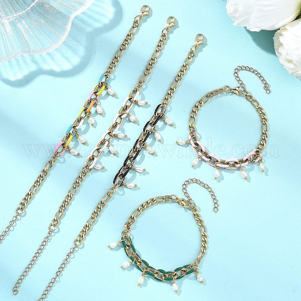 Браслеты с подвесками из натурального культивированного пресноводного жемчуга, 304 Браслеты-цепочки Фигаро из нержавеющей стали с эмалью для женщин, рис