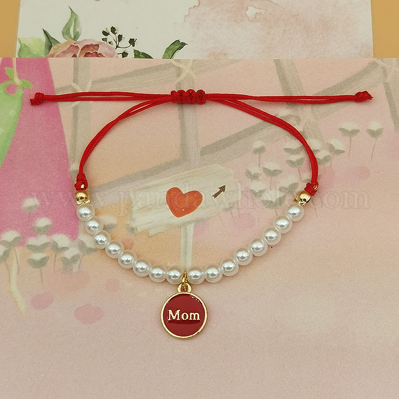 • Красный Браслеты с подвесками из эмали и сплава ко Дню матери, Регулируемые пластиковые браслеты из жемчужных бусин, плетеные из бусин, для женщин, Плоский круглый со словом мама, красные, 10.63 дюйм (27 см)