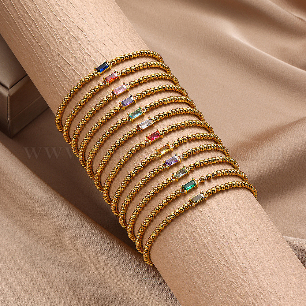 • Светло-зеленый Браслеты из нержавеющей стали с инкрустацией кубическим цирконием и камнями по знаку зодиака., круглые браслеты из бисера для женщин, прямоугольные, реальный 304 k позолоченный, светло-зеленый, 18 дюйм (6.69 см)