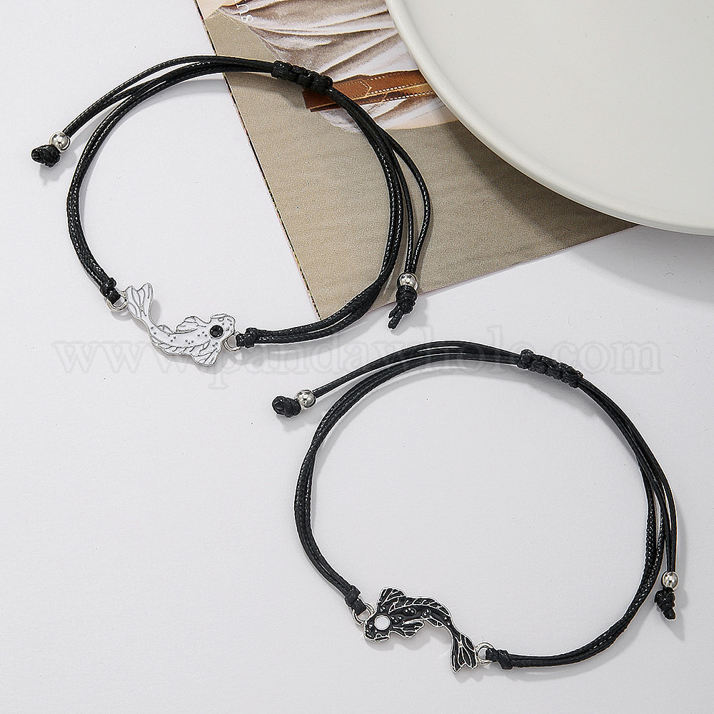2Набор браслетов из сплава с эмалированными звеньями, Регулируемые плетеные браслеты из вощеного шнура для пар, символ дружбы., инь-ян декоративный карп