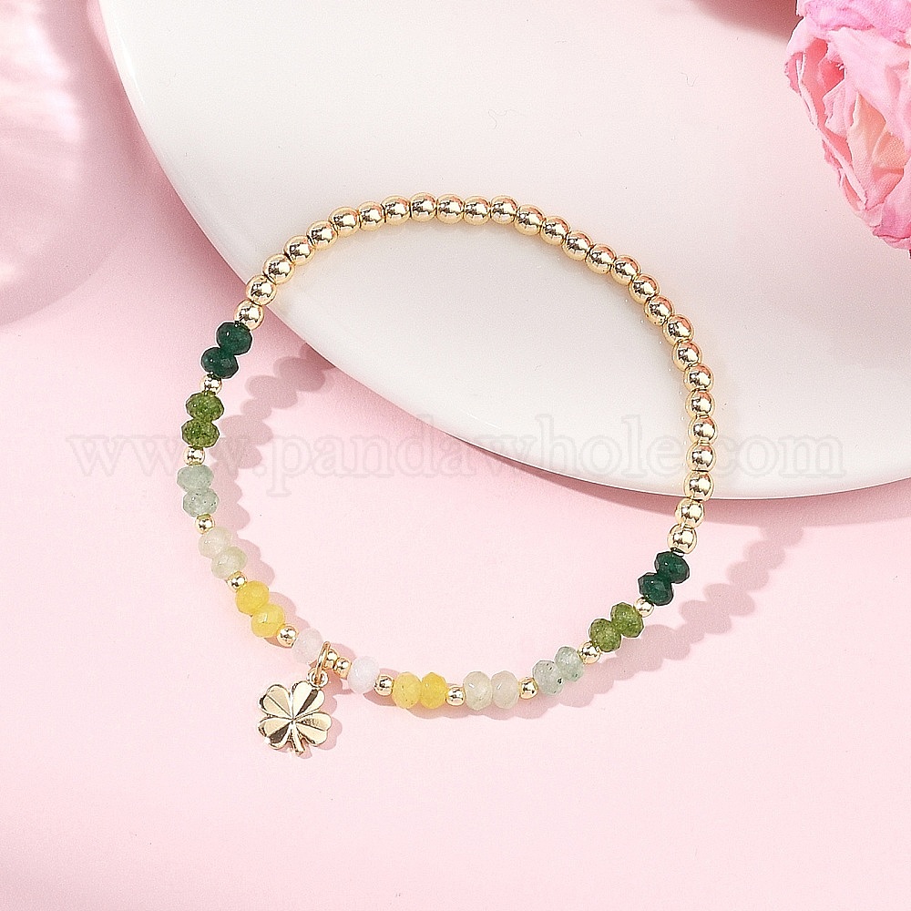 Браслеты с подвесками из латуни с клевером, Браслеты из окрашенного натурального малазийского нефрита и гальванически покрытых немагнитных синтетических гематитовых бусин, эластичные, для женщин.