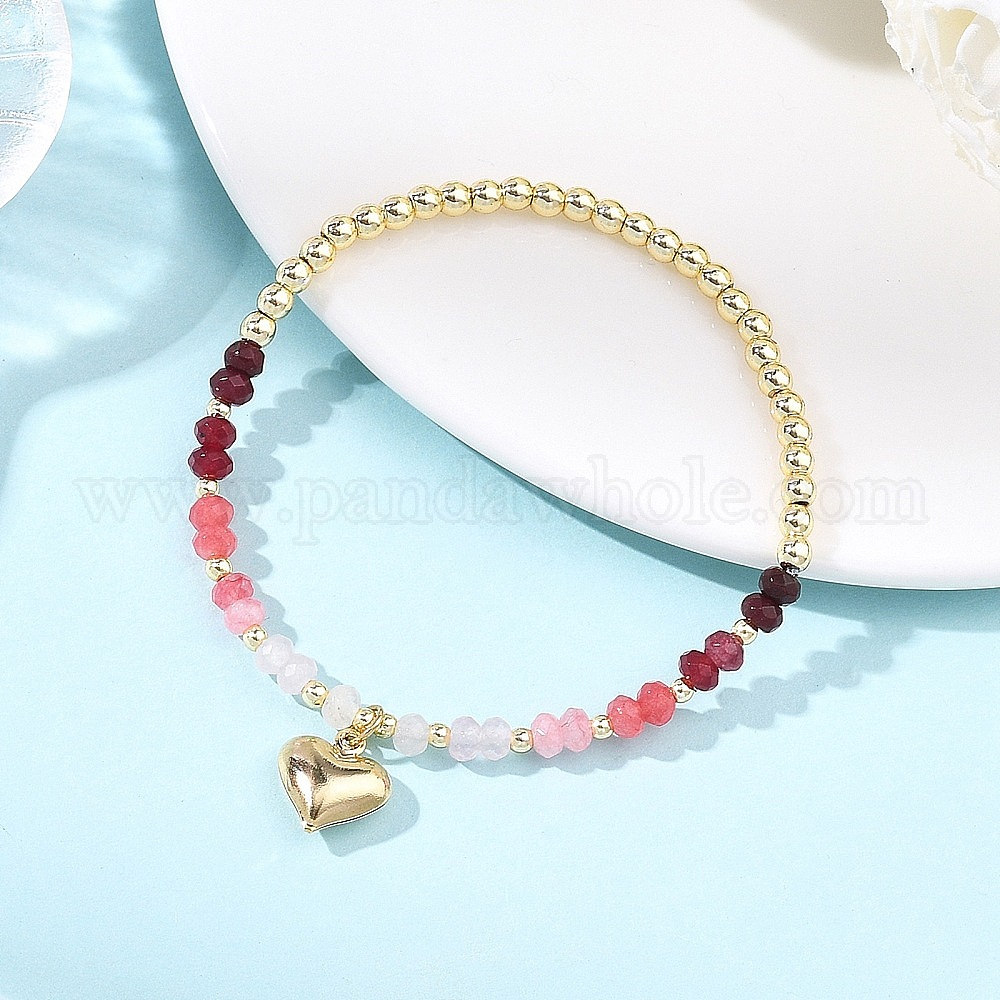 Браслеты с подвесками в виде сердечек из латуни, Браслеты из окрашенного натурального малазийского нефрита и гальванически покрытых немагнитных синтетических гематитовых бусин, эластичные, для женщин.