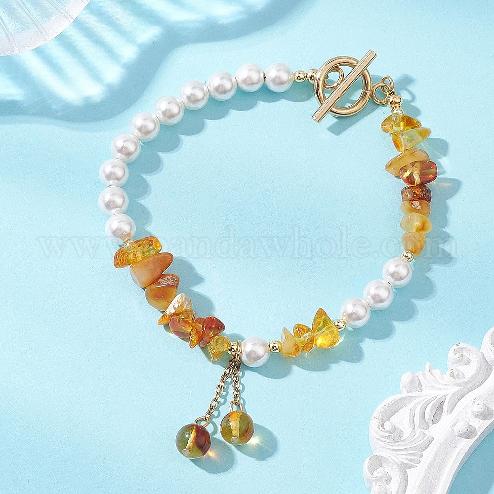 Браслеты из натурального янтаря с подвесками для женщин, Эластичный браслет для женщин из перламутра и натуральных янтарных бусин., круглый и чип, 304 из нержавеющей стали застежками тумблеры
