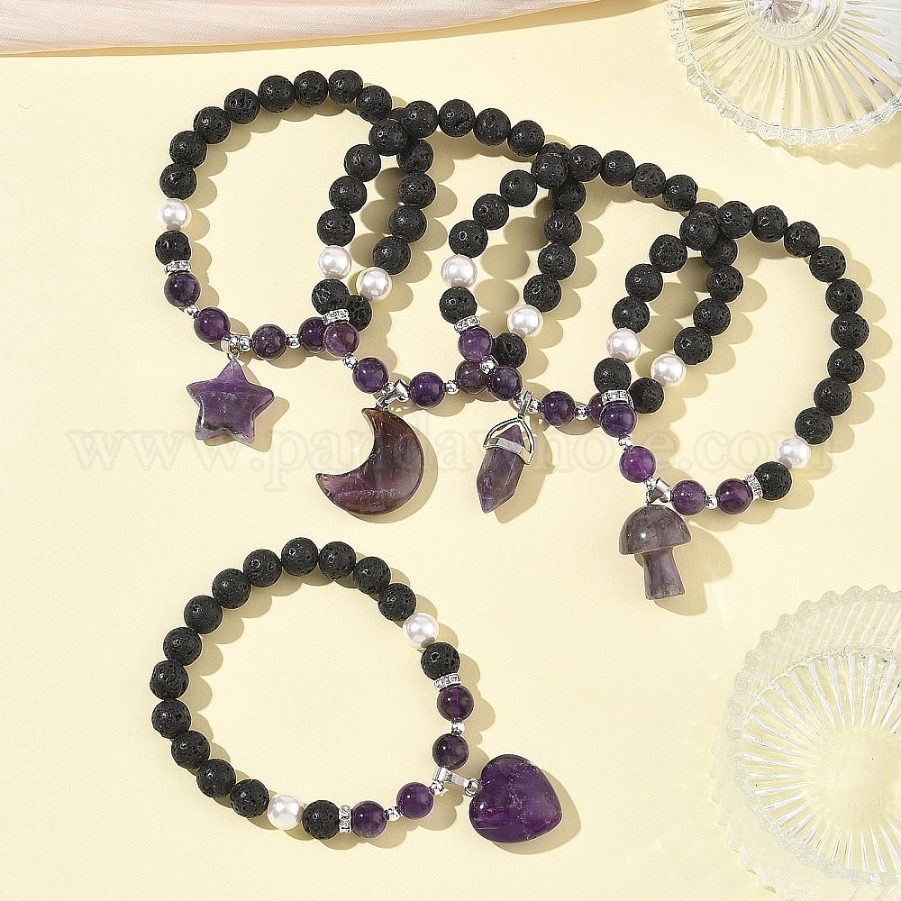 Браслеты с подвесками из натурального аметиста, лавового камня и жемчуга из ракушек., круглые эластичные браслеты из бусин для женщин, С немагнитным синтетическим гематитом