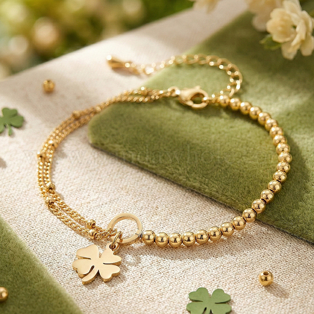 Браслеты с подвесками в виде четырехлистного клевера из нержавеющей стали, Браслеты-цепочки и двухслойные браслеты из шариковых цепочек для женщин