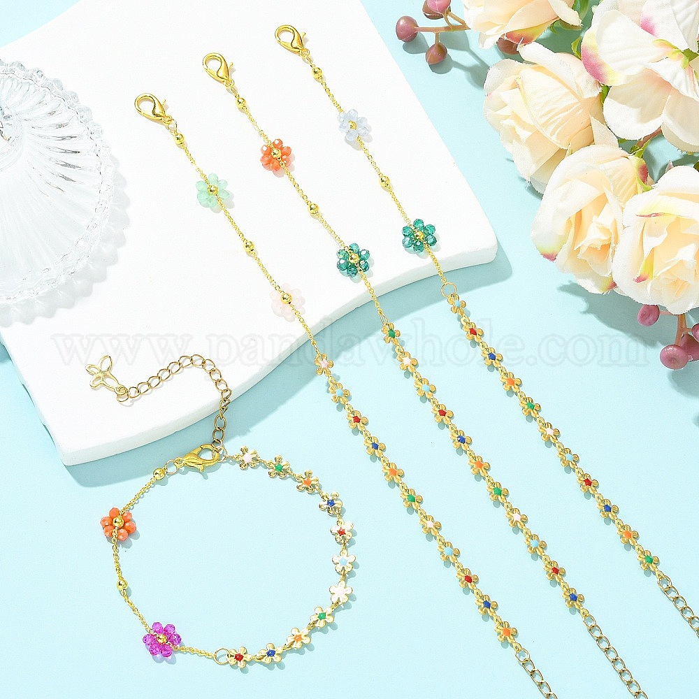Латунь ссылка браслеты, Женские цепочки ручной работы из латуни с эмалированными звеньями, цветок, золотые