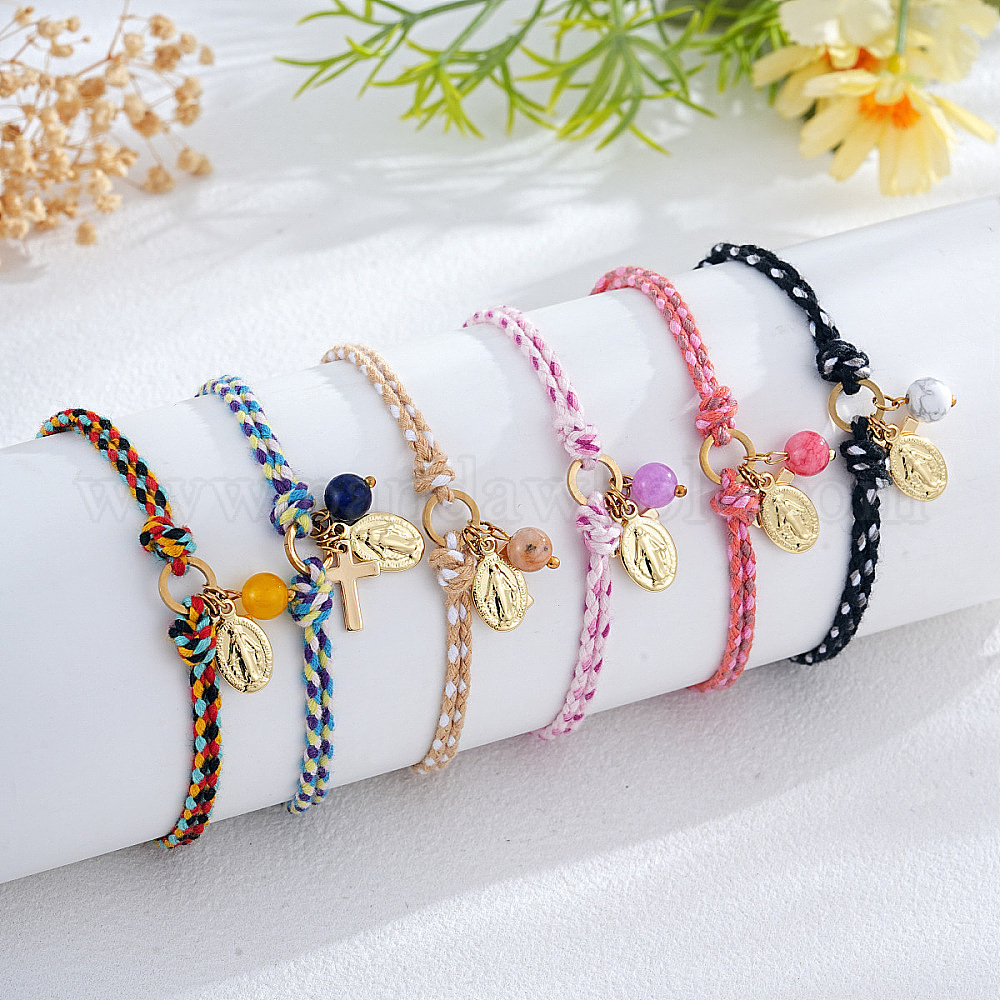Латунь шарм браслеты, Регулируемые браслеты из плетеного хлопкового шнура для женщин и мужчин, крест и овал с девой марией