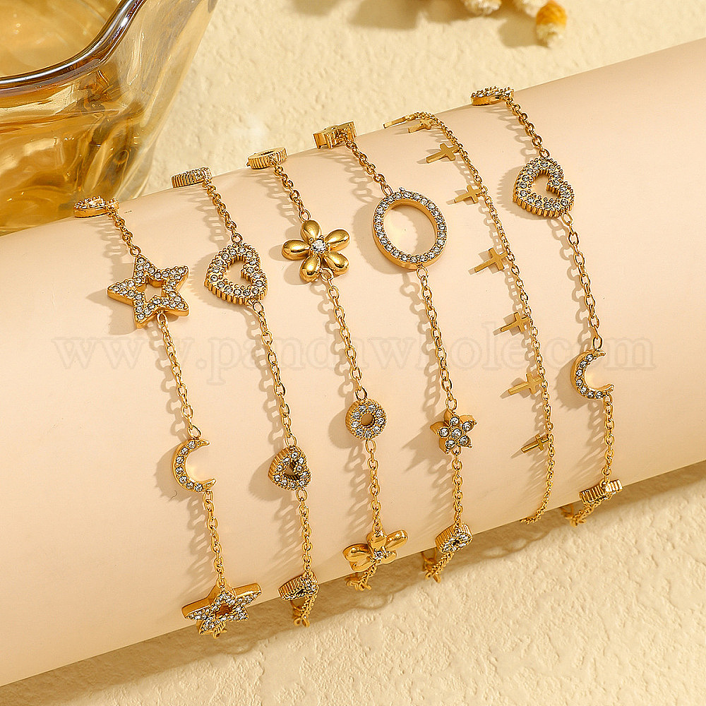 • Звезда 304 браслеты из нержавеющей стали с микропаве из прозрачных кубических цирконий, браслеты-цепочки для женщин, звезда и луна, 6.69 дюйм (17 см)
