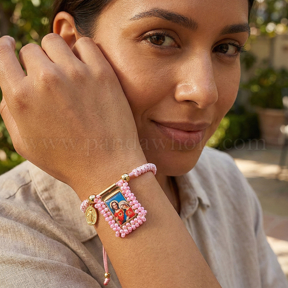 • Pink Браслеты с подвесками из нержавеющей стали с принтом, регулируемые плетеные браслеты из нейлоновой нити для женщин, прямоугольник с изображением Иисуса и Девы Марии, розовые, 304 дюйм (8.19 см)
