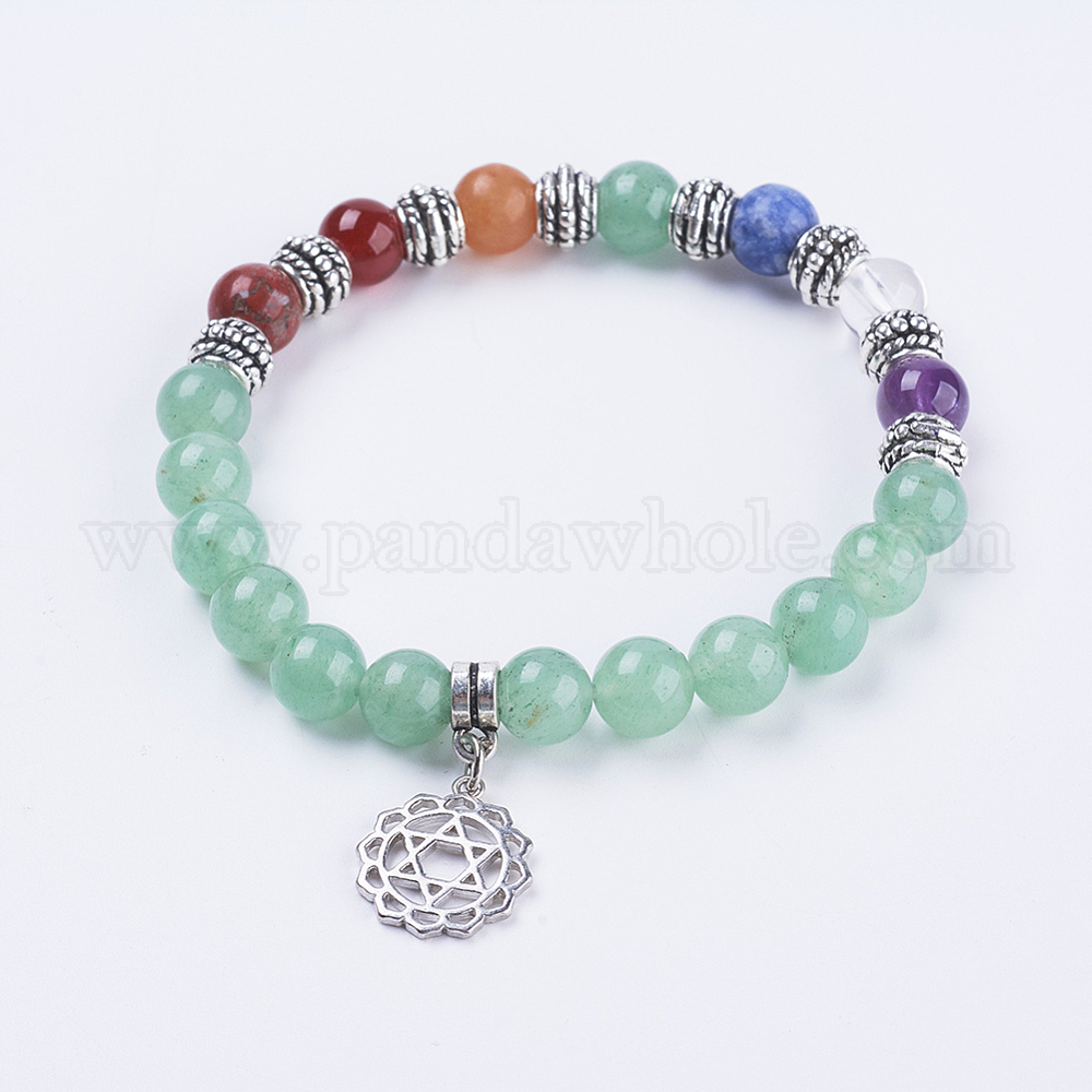 • Античное Серебро Природный зеленый авантюрин стрейч браслеты, со смешанным камня, результаты сплава и латунные подвески, для евреев, цветок со звездой Давида, античное серебро, 2-1/8 дюйм (54 мм)