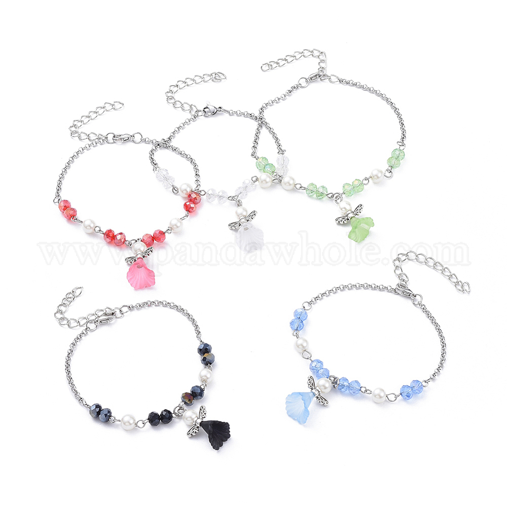 Шарм браслеты, с гранеными стеклянными шариками, Акриловые бусины, Стеклянные жемчужные бусины, цепи Роло и застежка на лобстере, ангел