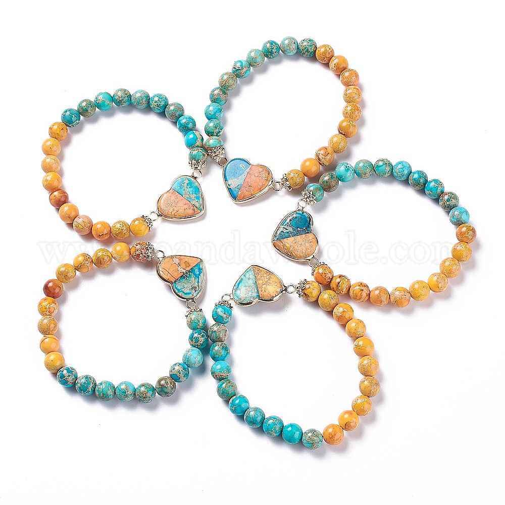 Браслеты с сердечками из натуральных драгоценных камней, с легкой позолоченной латунной фурнитурой, круглые