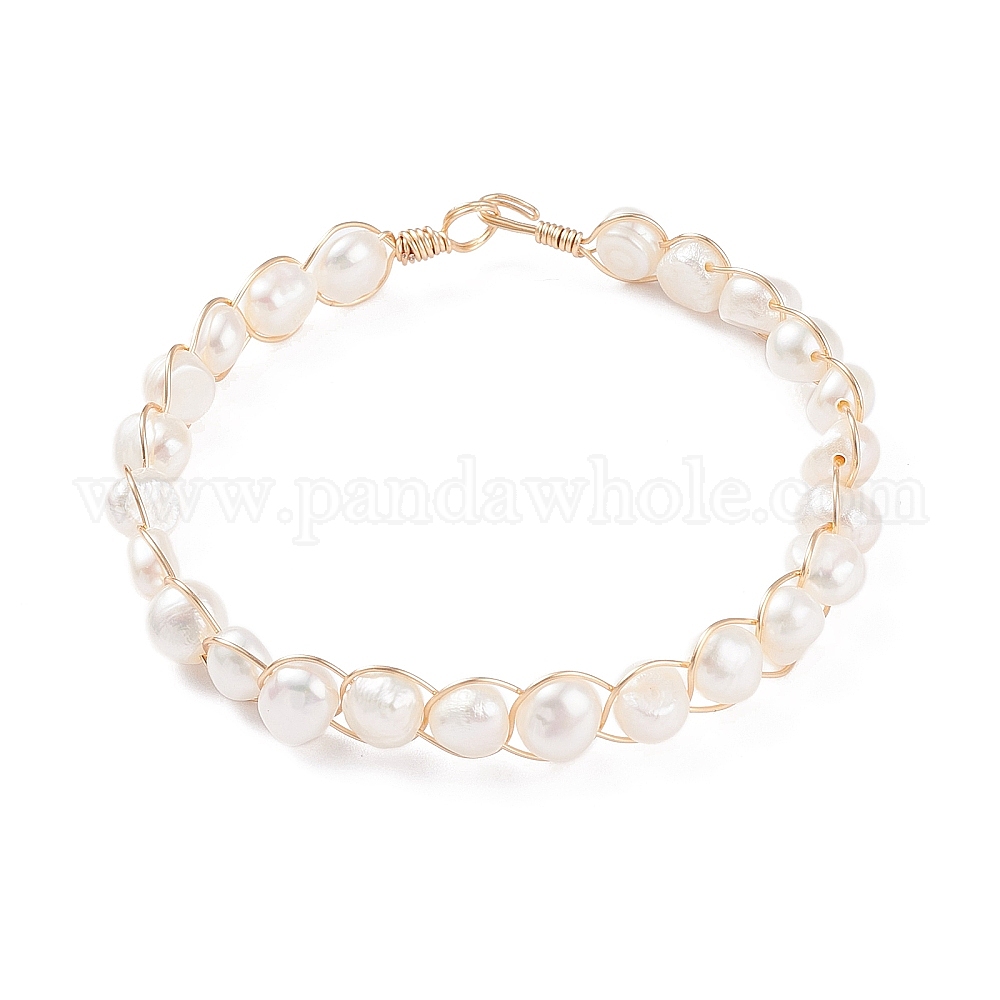 • Белый Женские браслеты из бисера из натурального культивированного пресноводного жемчуга, браслеты из бисера, обернутые медной проволокой, белые, внутренний диаметр: 2-1/8~2-1/4 дюйм (5.45~5.7 см)