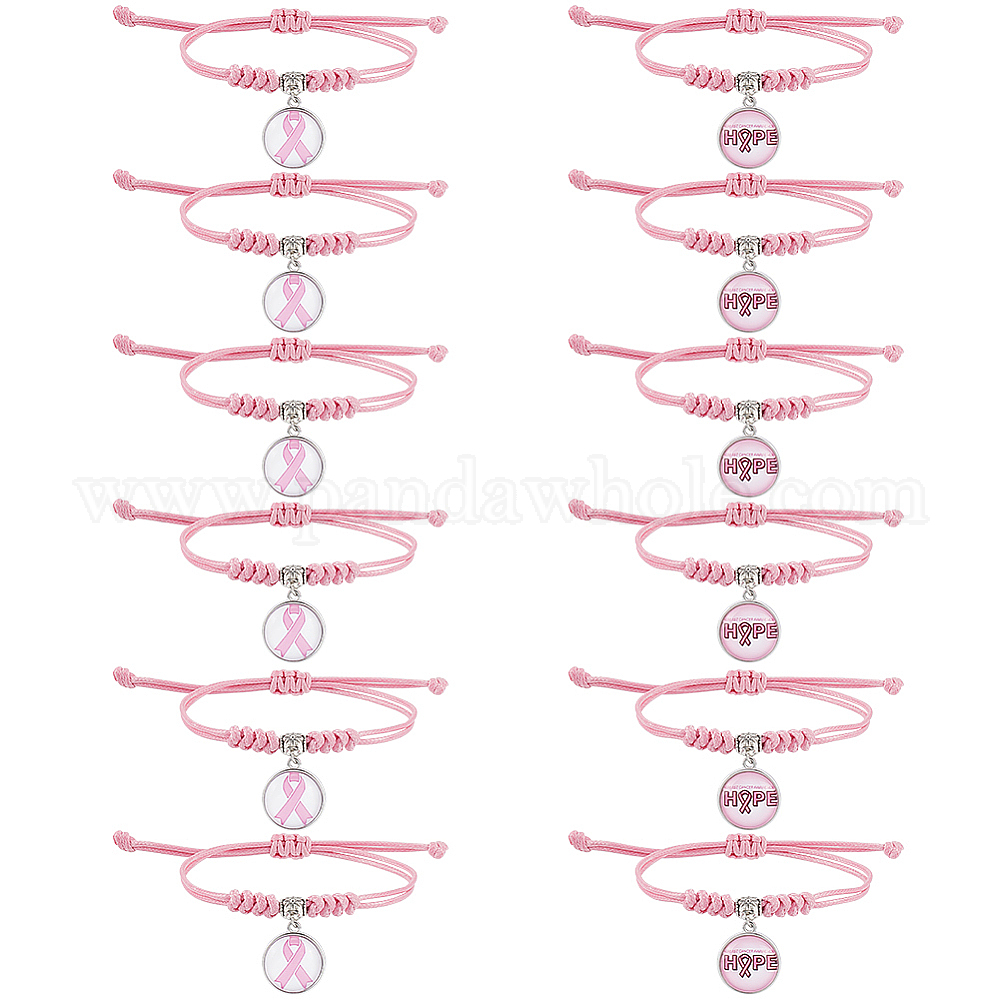 • Смешанные Узоры 12шт 2 стиль осведомленность о раке груди стеклянные подвески плетеный браслет из бусин, регулируемый браслет для женщин, розовые, внутренний диаметр: 7/8~3-1/8 дюйм (2.15~8.05 см), 6 шт / стиль