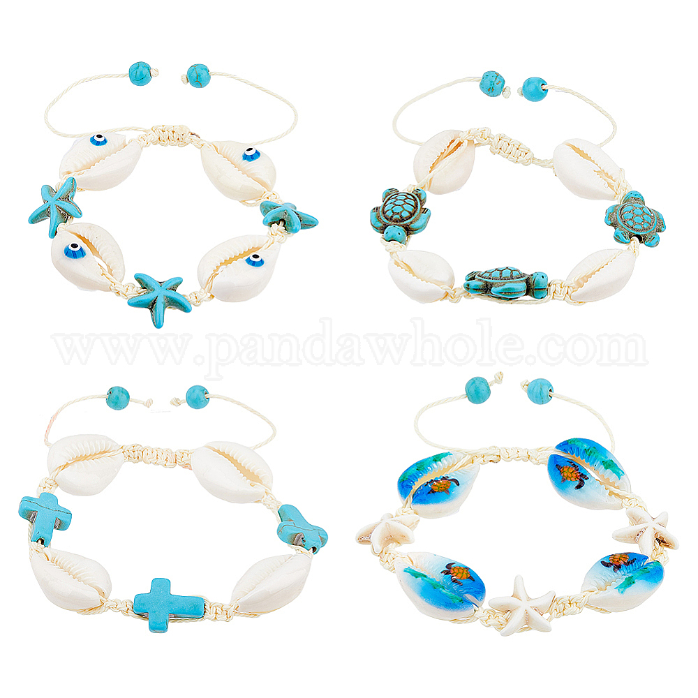 4шт 4 стиль натуральный ракушка с плетеными бусинами браслеты набор, регулируемые браслеты из полиэстера с крестом, морской звездой и черепахой