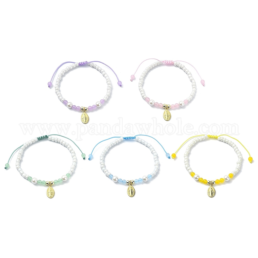 Браслеты из плетеных бусин из стекла с имитацией жемчуга, с натуральным и окрашенным малайзийским нефритом, регулируемые ювелирные изделия из латуни с религией Девы Марии для женщин (02QKT4)