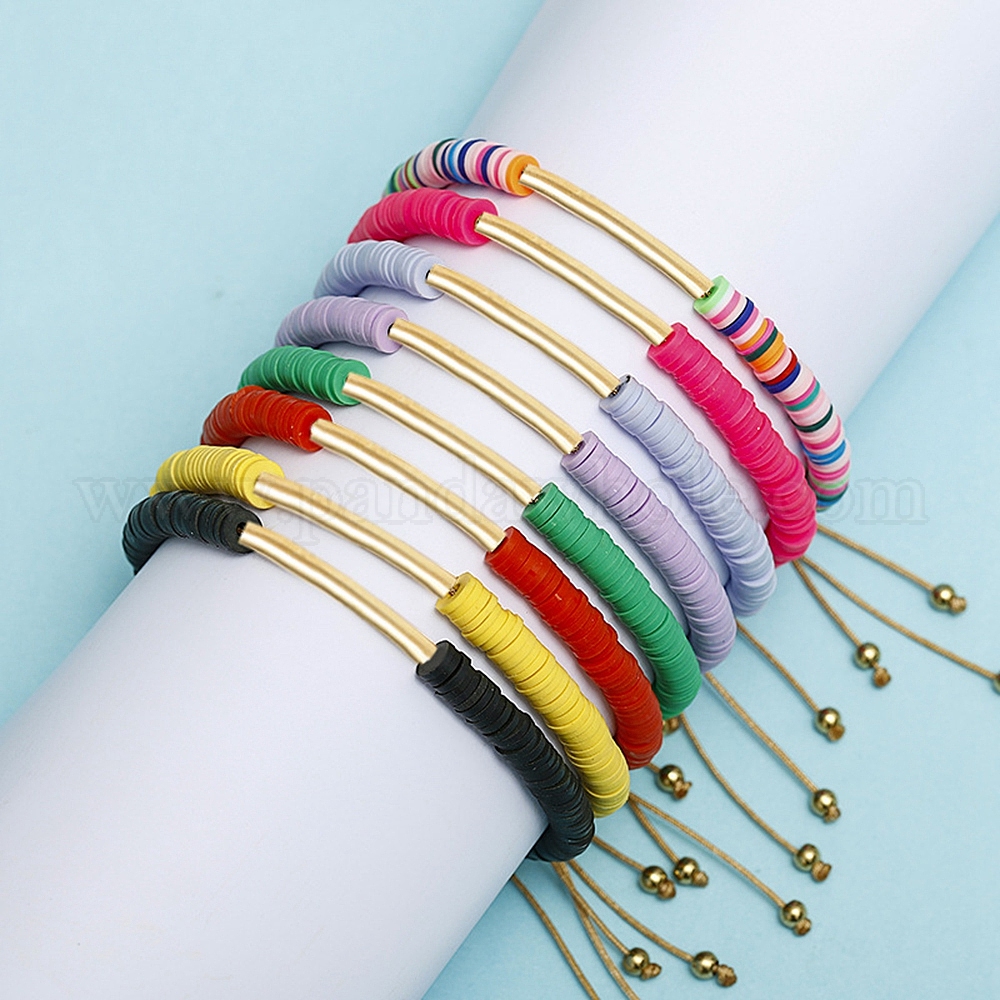 • Разноцветный Браслеты из плетеных бусин Heishi из полимерной глины, регулируемый браслет из латунных трубчатых бусин, красочный, 6-1/4~10-1/4 дюйм (16~26 см)