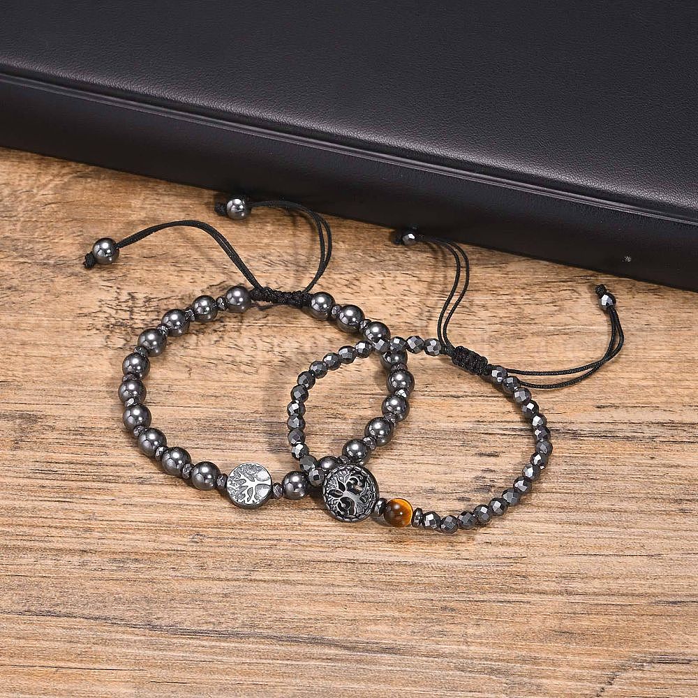 Браслеты из синтетического немагнитного гематита с плетеными бусинами, Регулируемые браслеты из бисера с узором «Древо жизни»