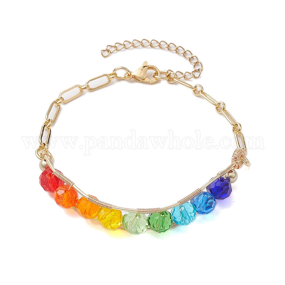 • Золотой Радужные граненые круглые браслеты из стеклянных бусин, украшения из латуни для женщин, золотые, 6-3/4 дюйм (17 см)