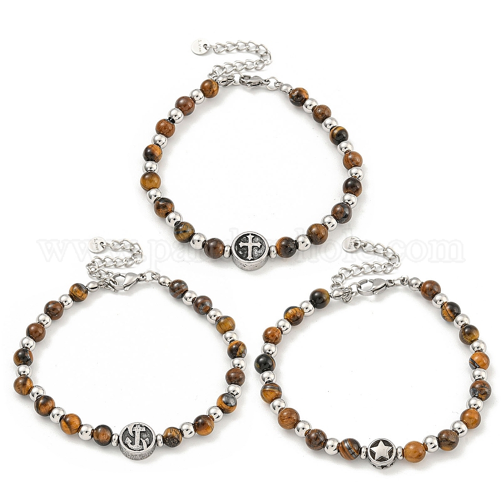 Звезда/якорь/крест 304 браслеты из нержавеющей стали и натурального тигрового глаза с круглыми бусинами для женщин